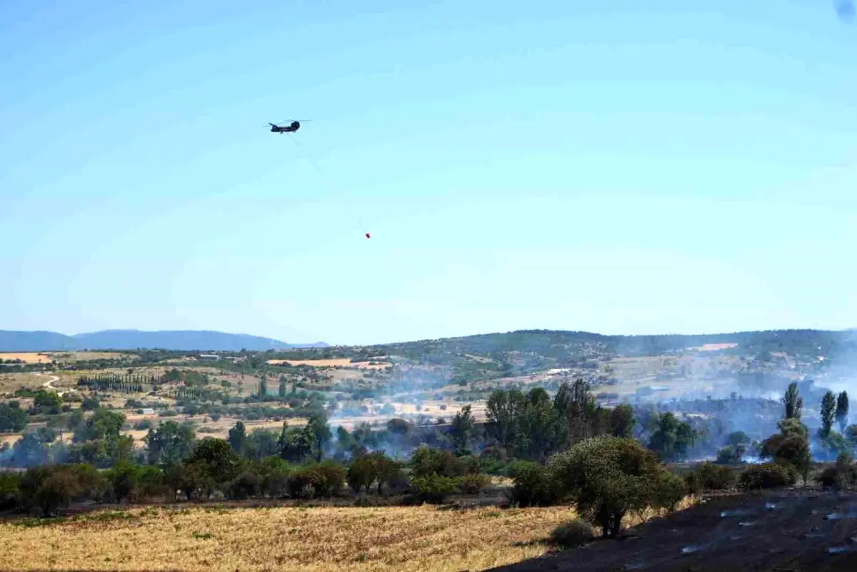 Balıkesir’in Pamukçu Mahallesi’nde tarım yerinde çıkan yangına havadan ve karadan müdahale ediliyor.